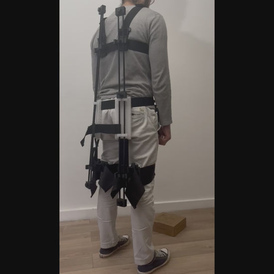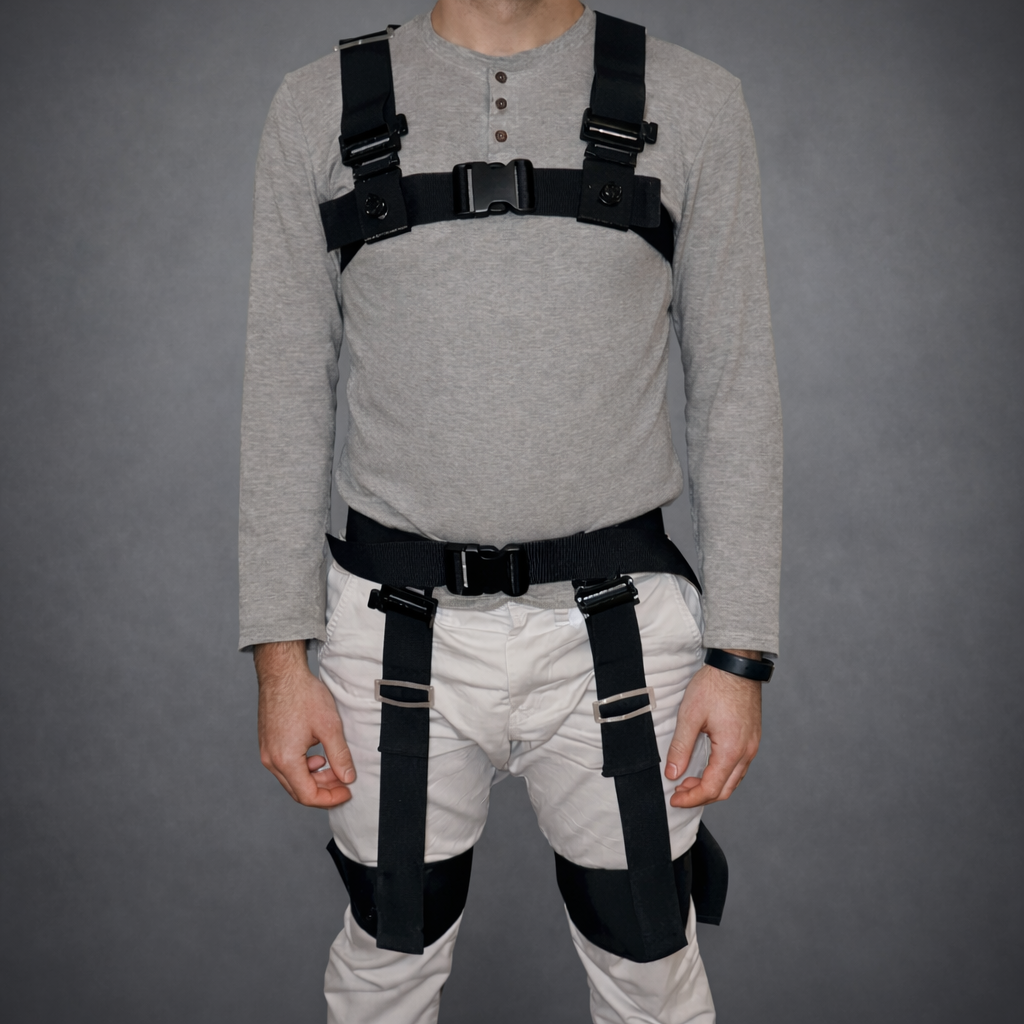 This product is in an early, experimental phase. We have limited data regarding long-term use. This product redistributes some of the force of gravity from your back to your thighs and chest to reduce back strain. It does NOT eliminate these forces on your body. By purchasing, you acknowledge and accept the inherent risks of these forces on your body. Do NOT use this product if you have existing injuries or health conditions. Always consult with a licensed medical professional before incorporating this into your routine. If you experience any discomfort, irritation, or pain, discontinue use immediately and seek professional advice. Do NOT attempt to carry or do more than your body is normally capable of without the device. When using the device, we have measured elastic forces of up to 10kg. In the event of mechanical failure, this force can be released abruptly behind the user. Do NOT use it when a person is directly behind the user.