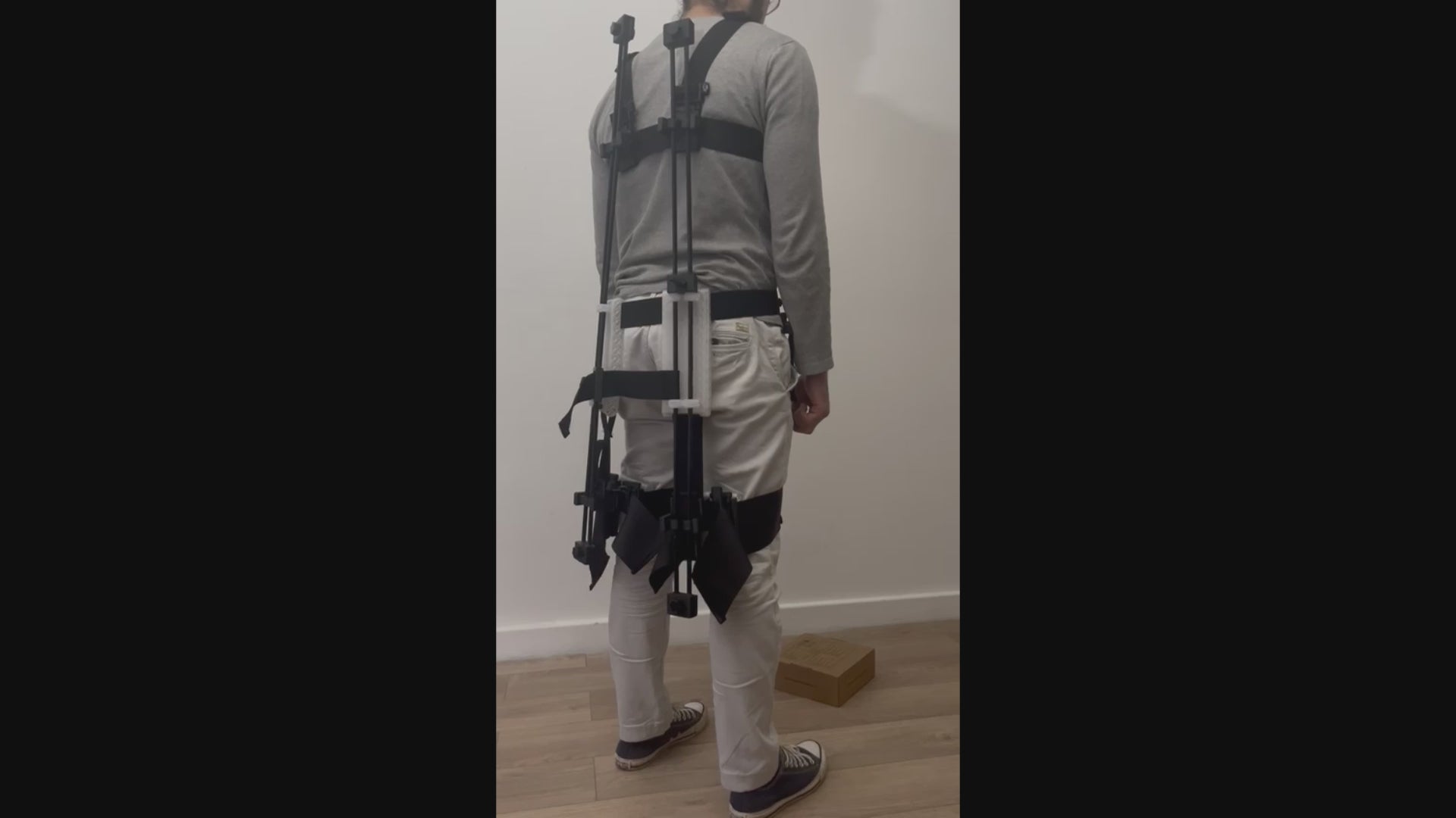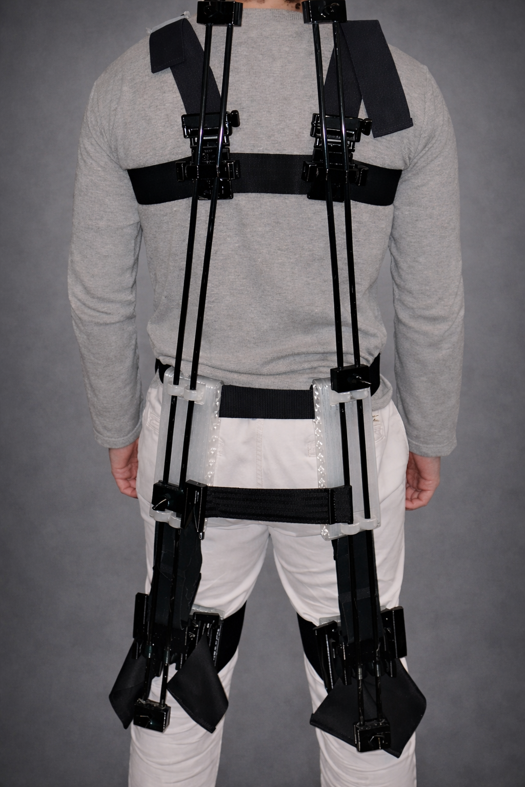 When bending down we do not exert too much energy, because we are moving towards the ground, the same direction that gravity is pulling us. However when we are getting back up, we must push against gravity. This device will store elastic energy as you bend down, releasing it as you get up, as if someone is pulling you up from the chest. We have measured this support force to be up to 9 kg, using a standard weight measuring device.